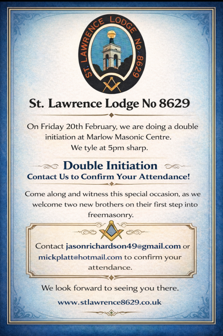 On Friday 20th February , we will be initiating not one, but two candidates into our lodge. This brings the total to four since our installation meeting in October last year.
